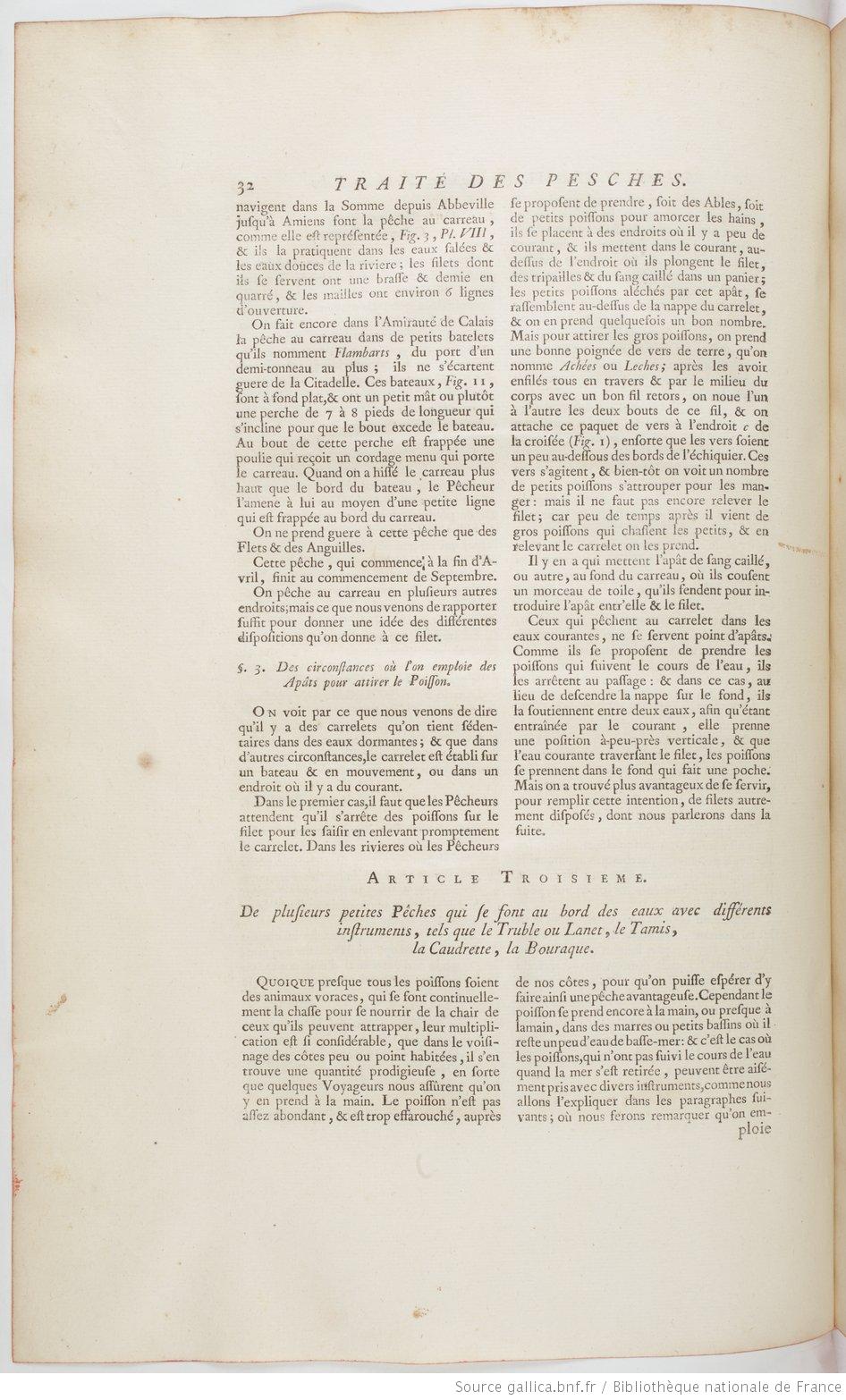 On lira avec profit l'article que Duhamel du Monceau (1700-1782) consacre � ce sujet dans Trait� g�n�ral des pesches et histoire des poissons qu'elles fournissent, tant pour la subsistance des hommes que pour plusieurs autres usages, qui ont rapport aux arts et au commerce (1769-1782, chez Saillant et Nyon, Paris). Nous le reproduisons ici :