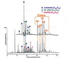Chromatogrammes partiels d'une cire d'abeilles actuelle [en haut] et d'un échantillon archéologique du site de Bercy [en bas]. (Document : Martine Regert).